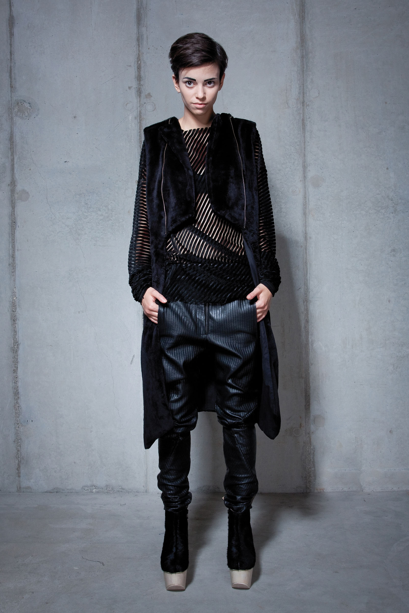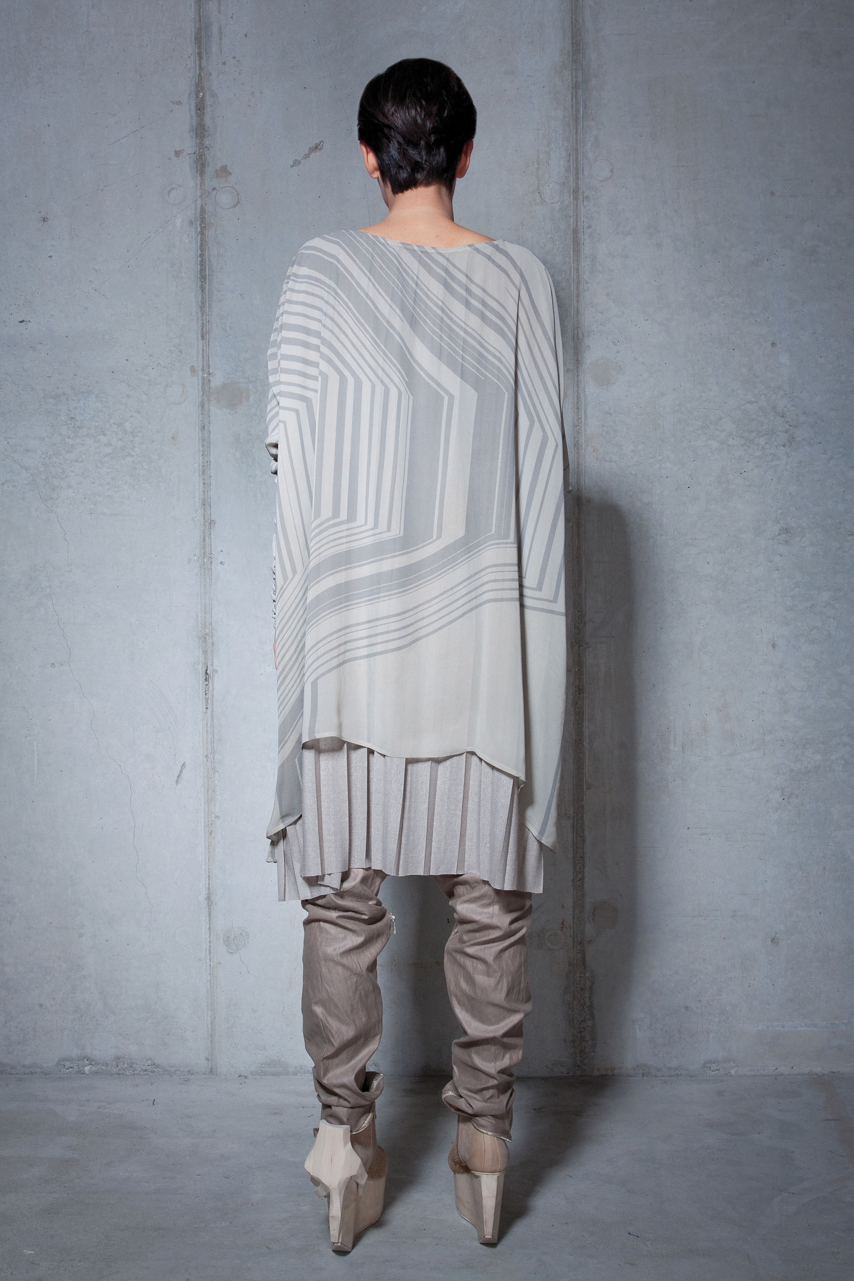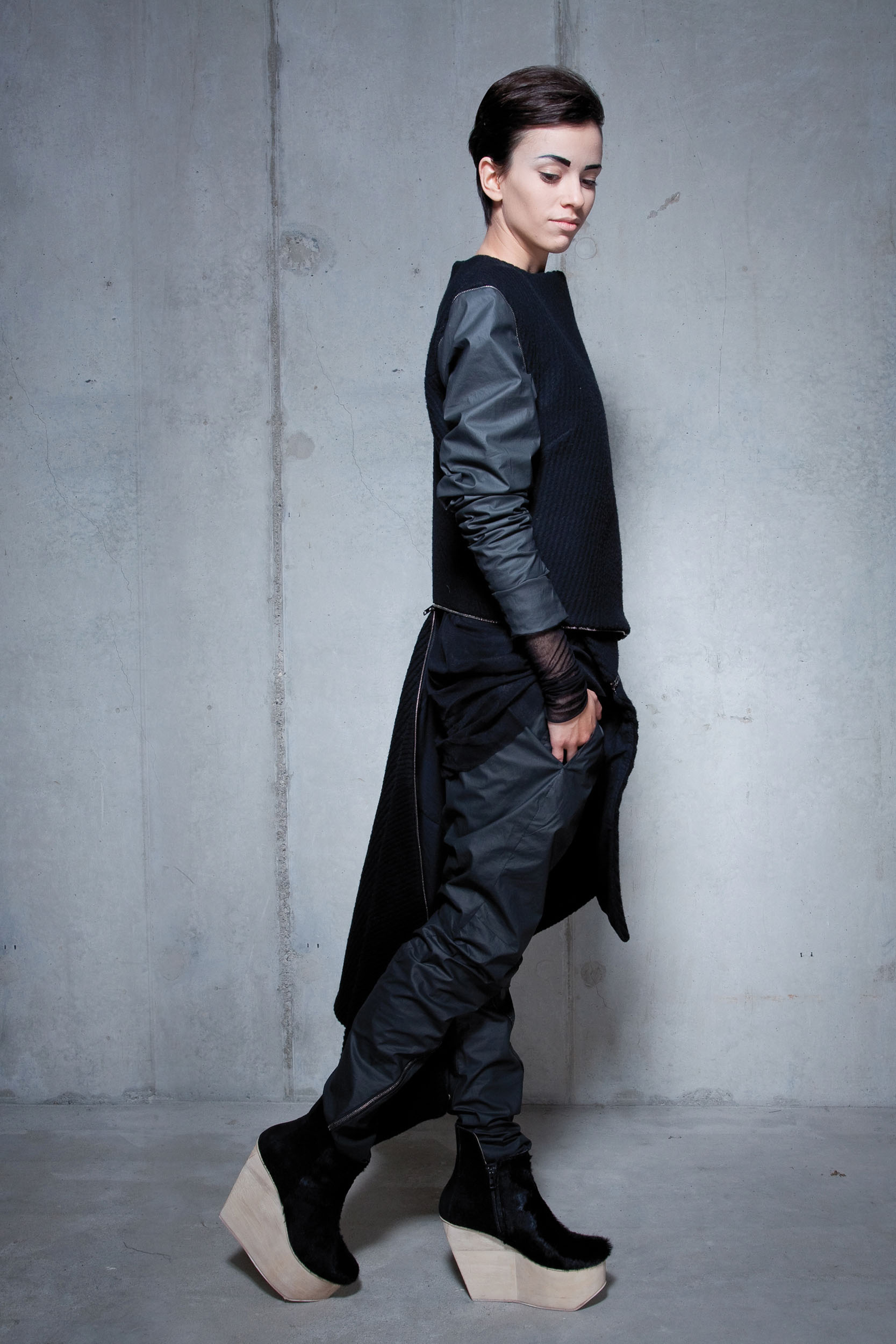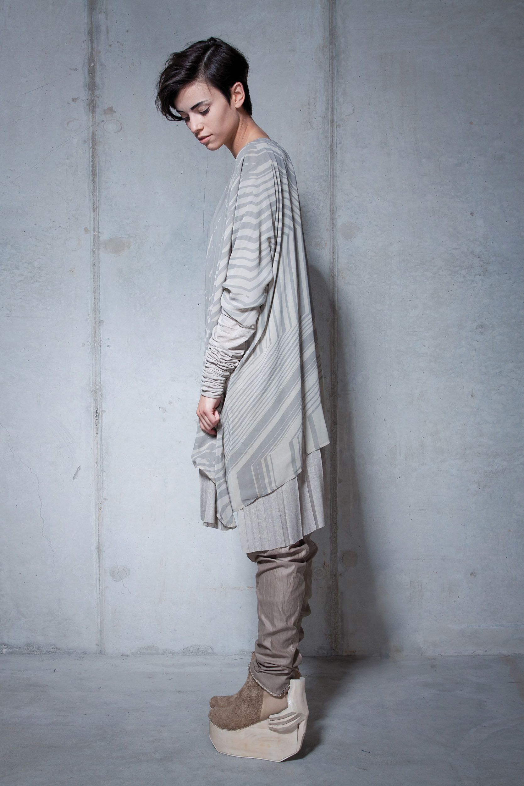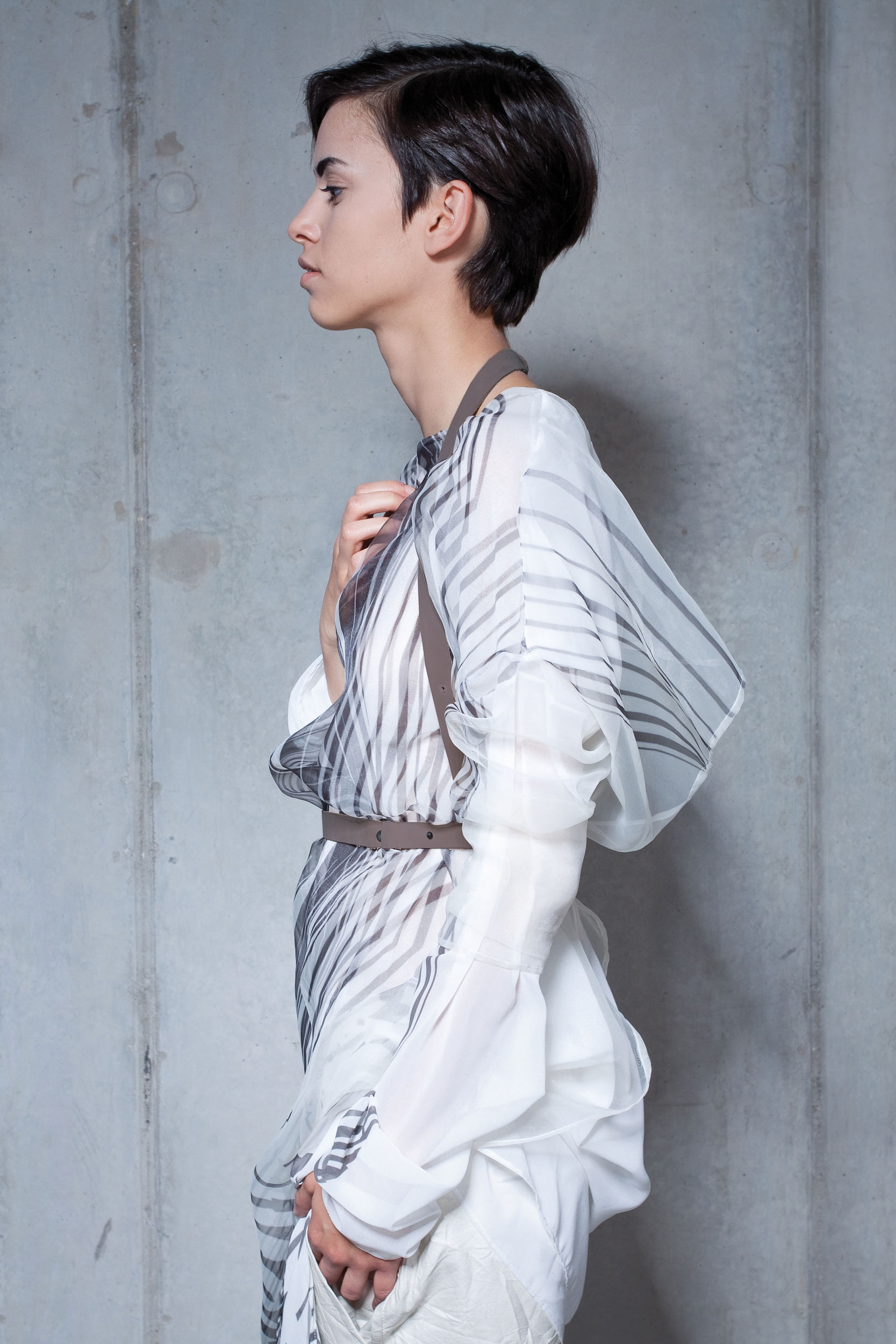 The N_HIL collection refers to the unique features of nature, such as wood grains and fingerprints. The monochromatic color palette emphasizes the raw and natural character of this collection. The sculptural 3D effect was achieved thanks to the skillful combination of natural, light and heavy fabrics and printing, which gives the whole thing uniqueness and depth.